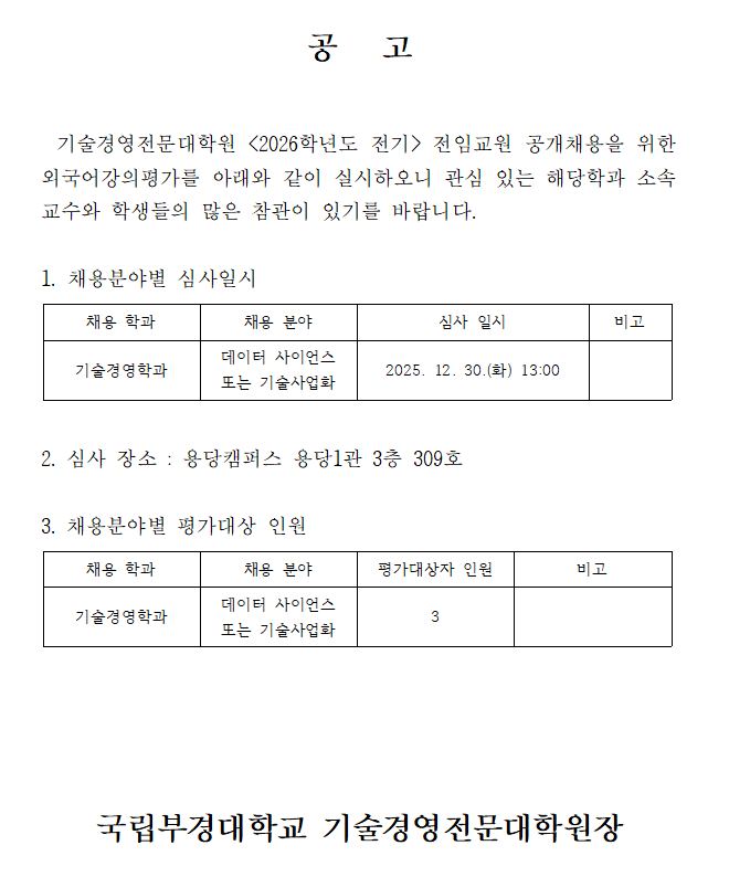 <2026-전기> 기술경영학과 전임교원 신규채용 외국어강의평가 안내