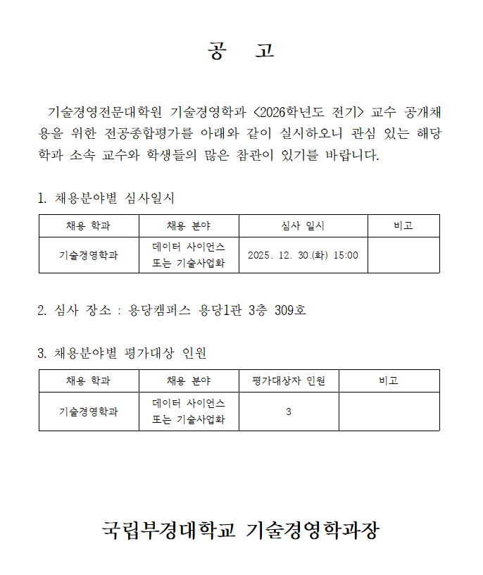 <2026-전기> 기술경영학과 전임교원 신규채용 전공종합평가 안내