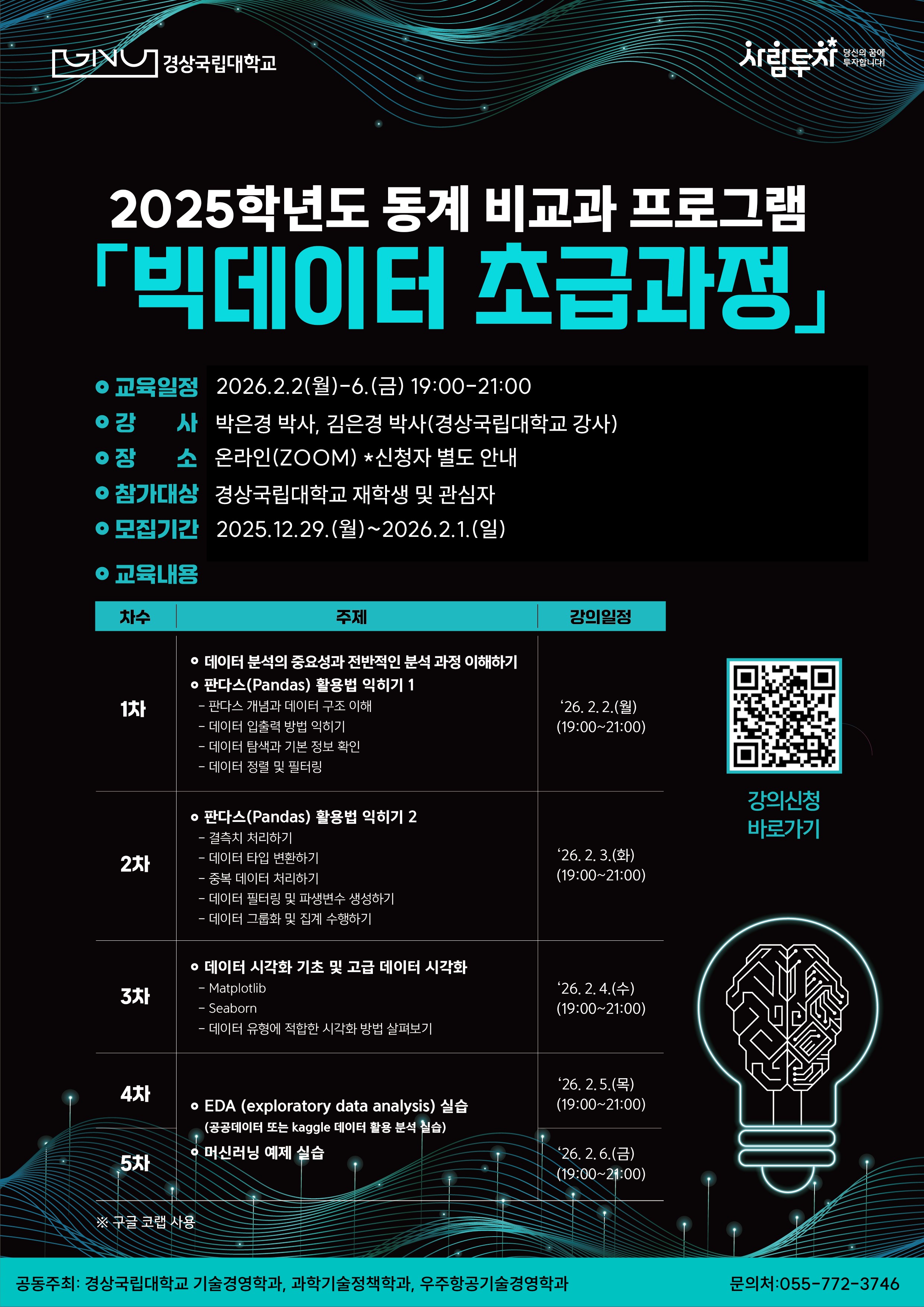 | [안내] 경상국립대학교 동계 비교과프로그램 '빅데이터 초급과정' 및 'Innovation Bootcamp' 개최 | |||