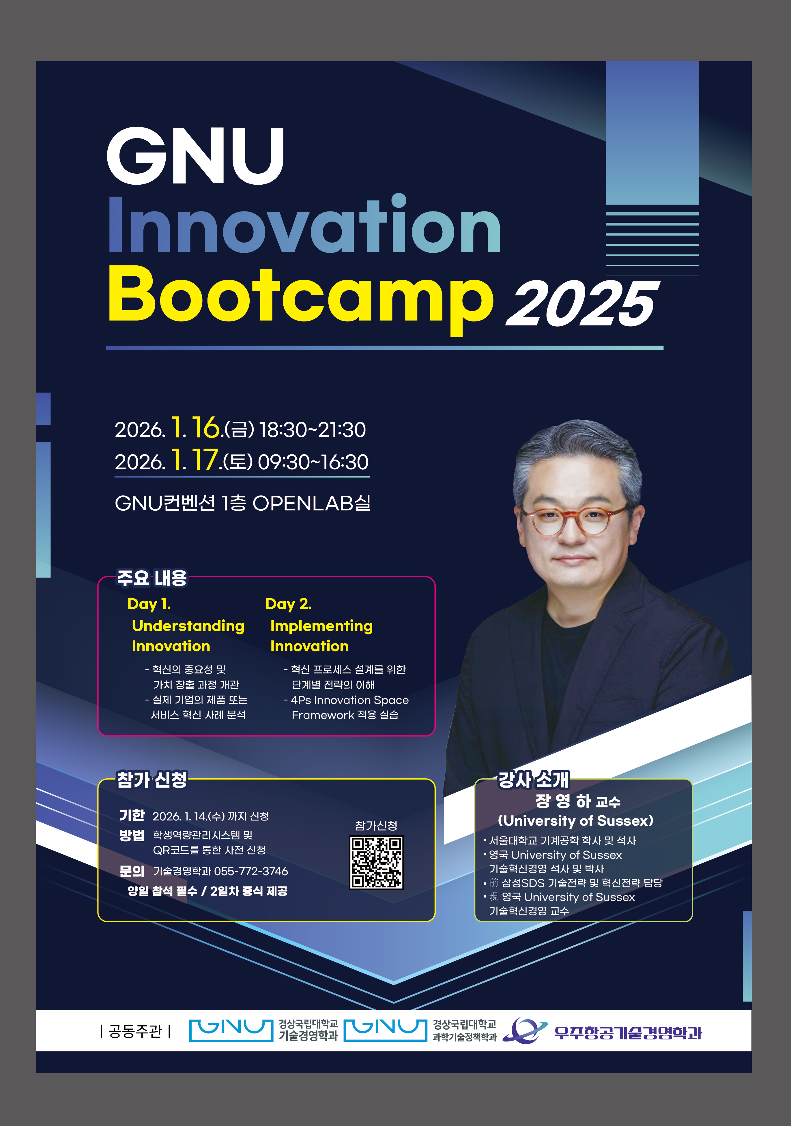 [비교과1] 강 의 명: GNU Innovation Bootcamp 2025 강의일자: 2026.1.16.-17. 강의방법: 대면 강의장소: 경상국립대학교 GNU컨벤션 OPENLAB실 신청방법: 포스터내 QR코드 접속(https://forms.gle/CxBb6KAsez8SCM6z9) - 선착순 30명 강 연 자 : 장영하 교수 (SPRU, University of Sussex) [비교과2] 강 의 명: 빅데이터분석 초급과정 강의일자: 2026. 2. 2.-6. 강의방법: 비대면(신청자에한해 ZOOM링크 발송) 신청방법: 포스터내 QR코드 접속(https://forms.gle/WR4979P6bCEyRUBx7) 강 연 자 : 박은경, 김은경 박사(경상국립대학교) ※ 문의사항: 055-772-3746 (경상국립대 MOT사업단) |