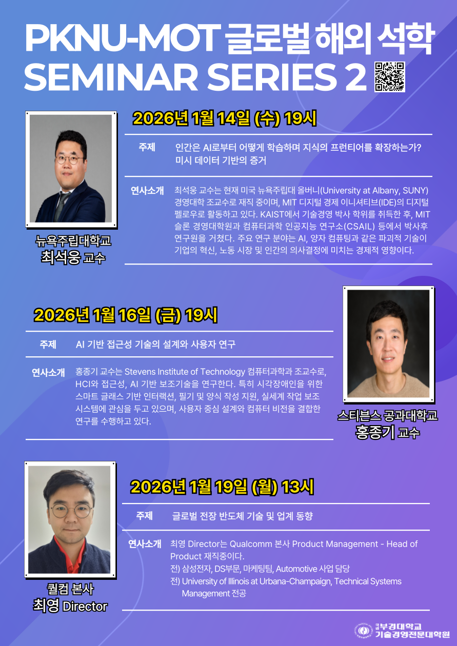 우리 대학원에서 글로벌 석학 세미나를 진행하오니 많은 관심 부탁드립니다. ★참여 신청: https://forms.gle/4kUThUtALzDwnJc16 <1차시> - 일시 : 2026년 1월 14일(수) 19시 - 연사: 뉴욕주립대학교 최석웅 교수 - 주제: 인간은 AI로부터 어떻게 학습하며 지식의 프런티어를 확장하는가? 미시 데이터 기반의 증거 <2차시> - 일시 : 2026년 1월 16일(수) 19시 - 연사: 스티븐스공과대학교 홍종기 교수 - 주제: AI 기반 접근성 기술의 설계와 사용자 연구 <3차시> - 일시 : 2026년 1월 19일(월) 13시 - 연사: 퀄컴 본사 최영 Director - 주제: 글로벌 전장 반도체 기술 및 업계 동향 ★참여 신청: https://forms.gle/4kUThUtALzDwnJc16 ※ 문의 및 회신기한 - 문의 : 국립부경대학교 기술경영전문대학원 행정실 (전화: 051-629-5656, 이메일: goal_mot@pknu.ac.kr) - 회신기한 : 2026년 1월 14일(수) 17시까지 |
